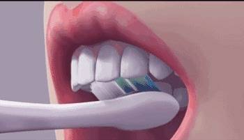 第二步:刷门牙内侧。同样呈45度角斜放,上排牙齿向下,下排牙齿向上提拉轻刷。